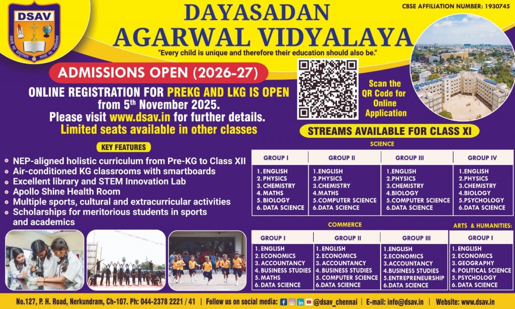 Established in 2015, Dayasadan Agarwal Vidyalaya (DSAV) is a CBSE-affiliated, co-educational institution located in Nerkundram, Chennai. A joint initiative of Dayasadan Children’s Town (DSCT) and the Agarwal Relief & Educational Trust (ARET), the school began with just 700 students and now nurtures over 1600 learners. With a strong foundation in Indian values and a modern, global outlook, DSAV is committed to academic excellence, character-building and holistic development.